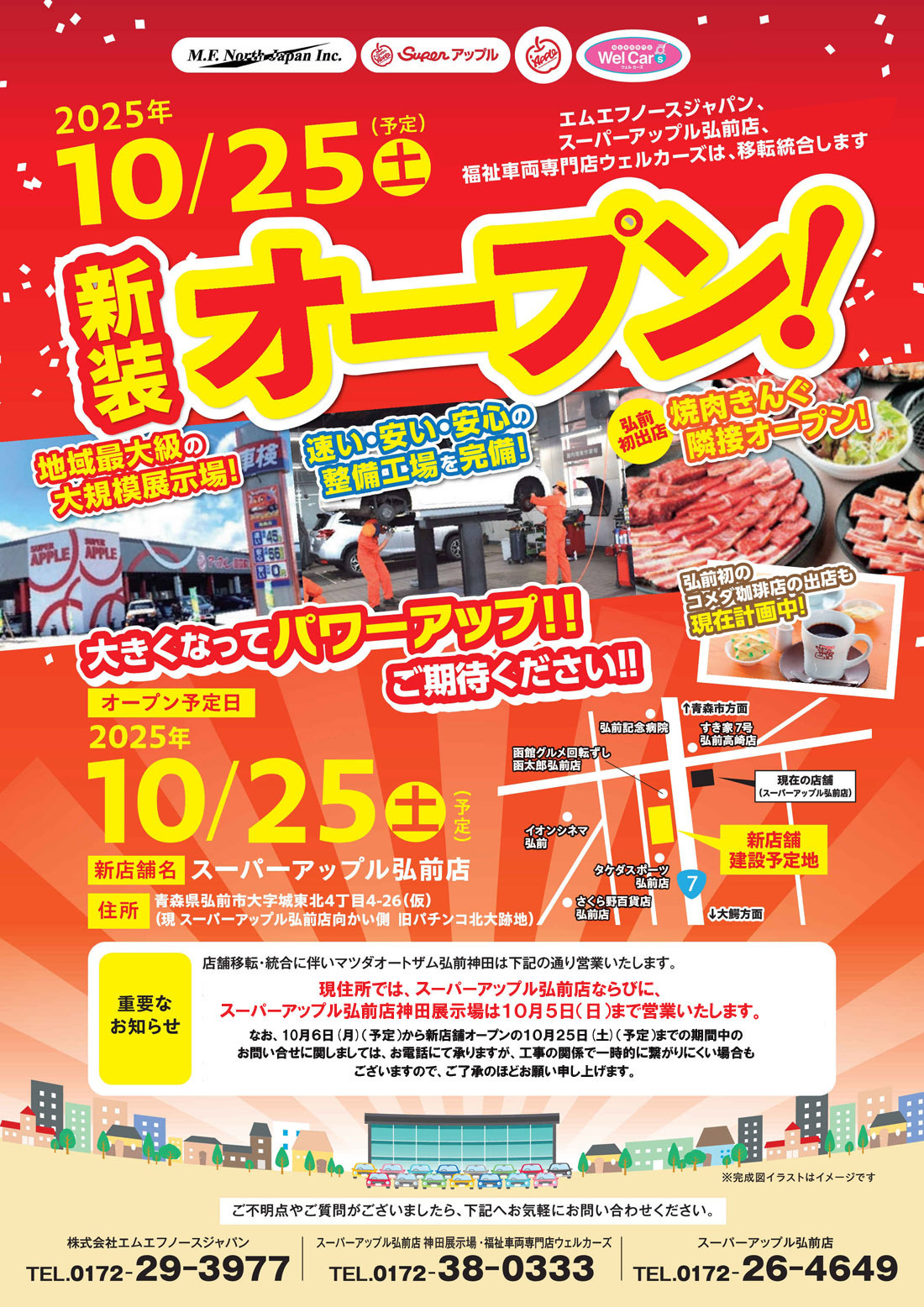 福祉車両専門店ウエルカーズ、エムエフノースジャパン、スーパーアップル弘前店は、移転統合を予定しています。
