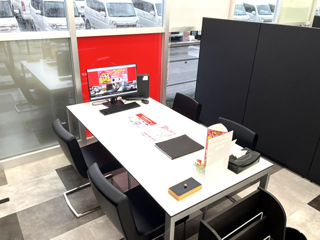 新築の明るいショールームには、プライベートに配慮した個室ブースが6室。商談もお待ちの間も快適にお過ごしいただけます。フリードリンク・キッズスペース・雑誌・大型テレビなど設備も充実。